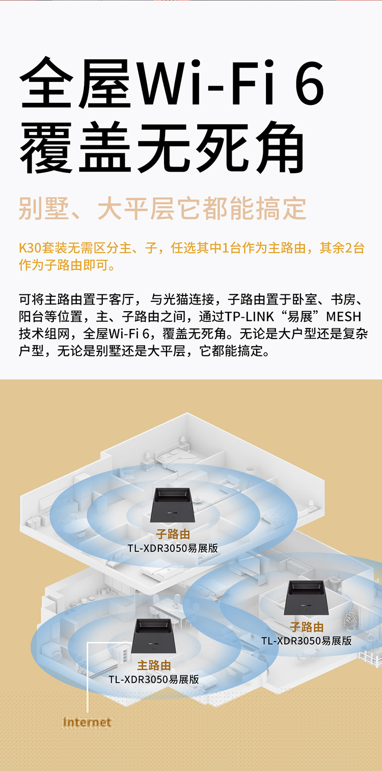 TP-LINK 全屋WiFi6 子母路由器 AX3000分布式三只装K30 千兆无线双频 别墅大户型易展Mesh 无缝漫游