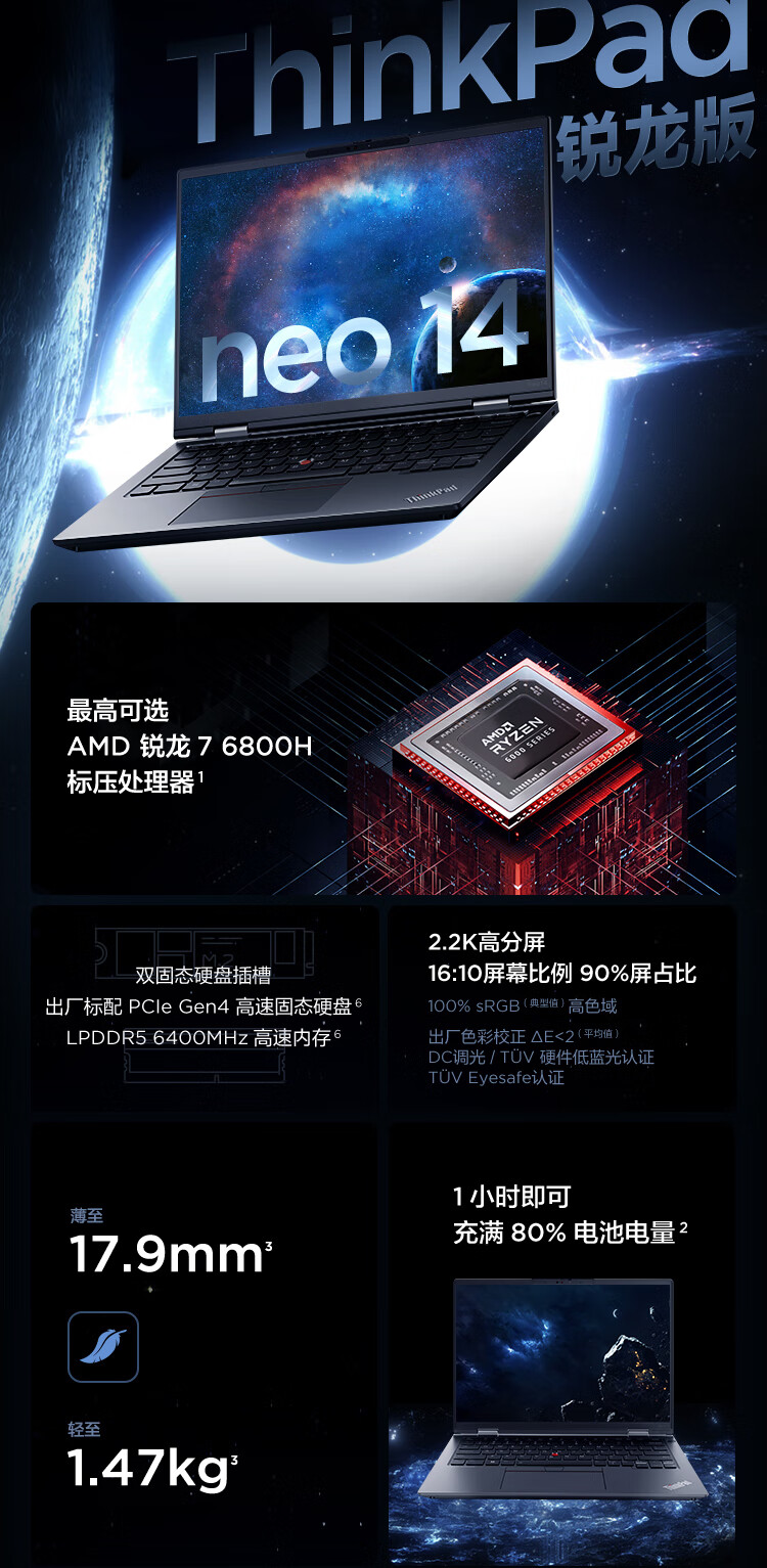 联想ThinkPad neo 14英寸高性能标压商务办公轻薄笔记本电脑 R7-6800H 16G 512G 2.2K高色域