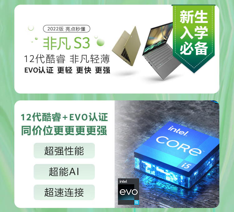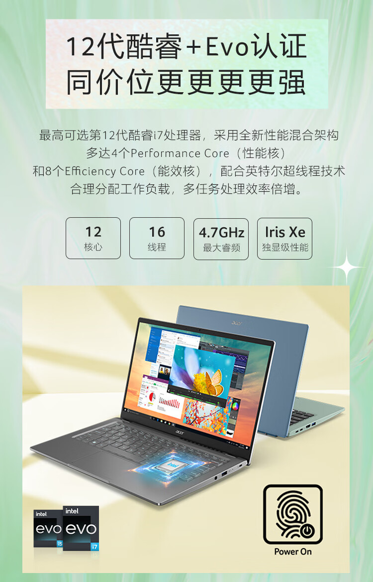 宏碁(Acer)非凡S3 全新12核酷睿Evo轻薄本 14英寸2.5K高色域 办公学生笔记本电脑(12代i5-1240P 16G