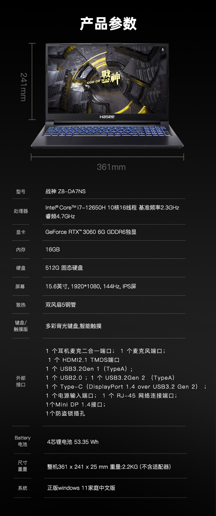 神舟(HASEE)战神Z8-DA7NS 12代英特尔酷睿i7 15.6英寸游戏本 笔记本电脑(12代i7-12650H 16G 512G
